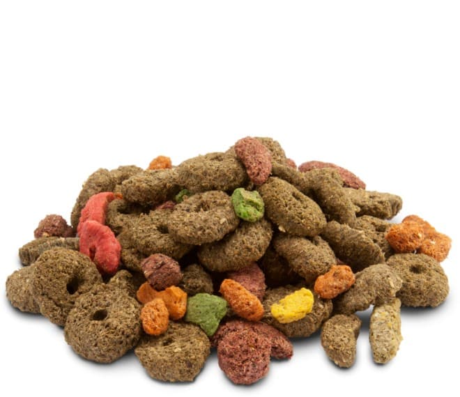- С вкусными кольцами люцерны, кусочками овощей и морковным хрустом
