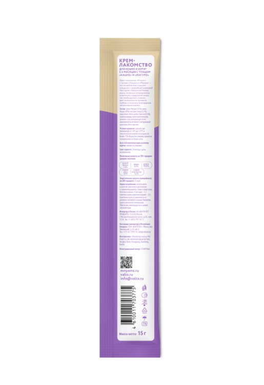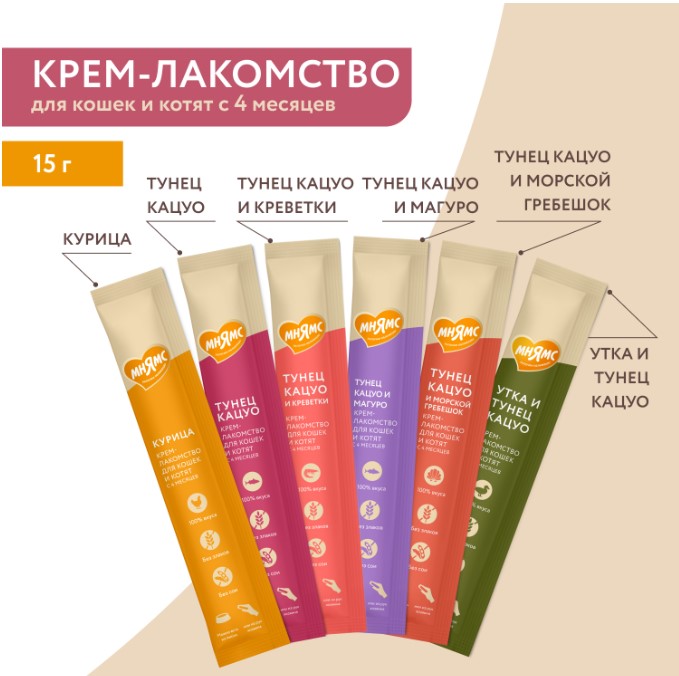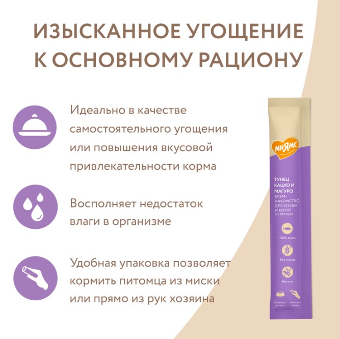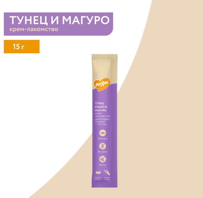 Крем-лакомство с тунцом Кацуо и Магуро Тёмно-красное мясо деликатесного малого тунца и красное стейковое мясо желтопёрого тунца Крем-лакомство «Мнямс» с тунцом – это изысканное угощение с нежнейшей кремовой консистенцией. Утонченный вкус приводит кошек в восторг, а яркие эмоции довольных любимцев при кормлении с рук дарят хозяевам ощущение полного счастья. Подается как порционное угощение, или добавляется в виде аппетитного соуса к основному рациону для обогащения вкуса привычных блюд. Изготовлено по новейшей японской технологии и соответствует мировым стандартам качества.