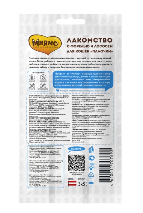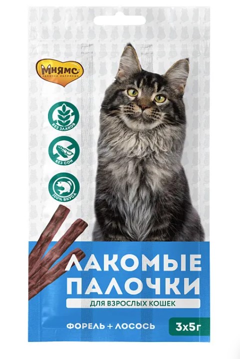 Мнямс лакомые палочки для кошек с лососем и форелью станут любимым угощением для вашего питомца. Кроме того, что каждая палочка содержит высококачественные морепродукты, в ее состав также входят и продукты растительного происхождения, которые гарантировано подарят кошке здоровый вид.