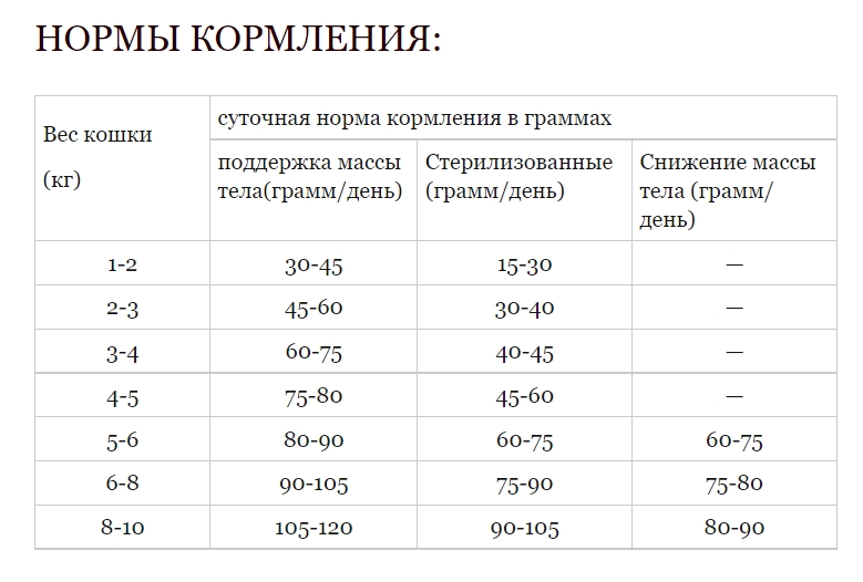 после отлучения (приблизительно 5 недель) суточная норма корма составляет (60 г) на 1 кг массы тела; с 20-недельного возраста (приблизительно с 5 месяцев); суточная норма корма составляет (30 г) на 1 кг массы тела. С 52 недельного возраста – переход на рацион для взрослых котов.