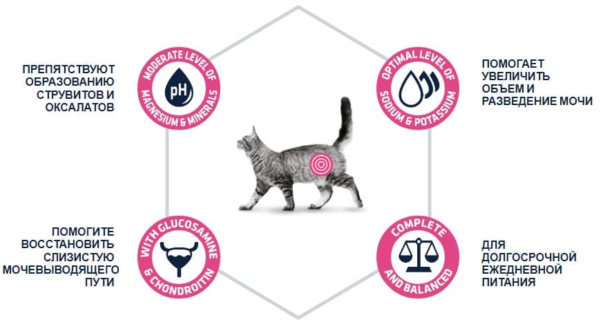 Кроме того, продукт предлагает полноценный и сбалансированный рацион для ежедневного питания кошек, склонных к проблемам с мочеиспусканием.