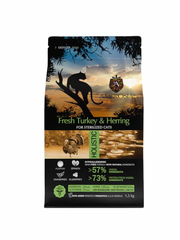 Особенности гипоалергенного корма для стерилизованных кошек Ambrosia Grain Free Sterilized Cat с индейкой и сельдью: