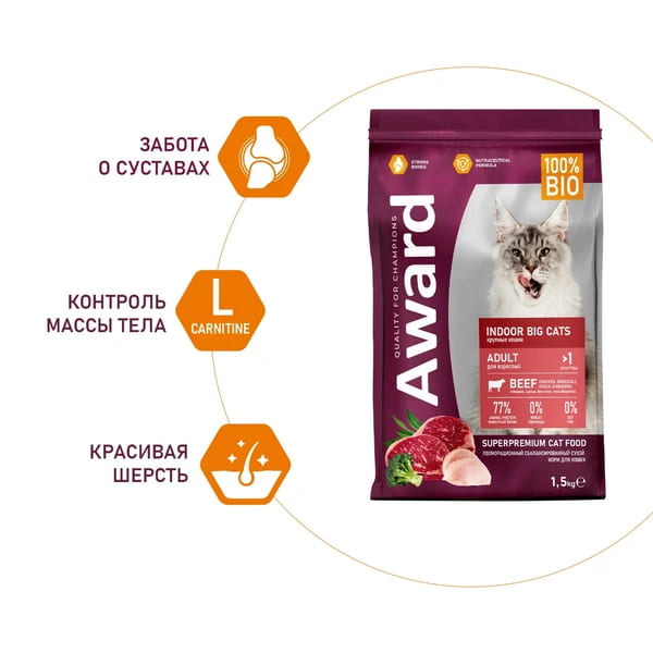 Сухой корм AWARD Indoor Big cats для взрослых домашних кошек крупных пород с говядиной и курицей с добавлением брокколи и юкки Шидигера.