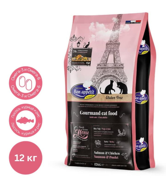 Бон Аппетит Кэт Эдалт Гурманд – это продукт богатый лососем, он способствует поддержанию здоровой и блестящей шерсти благодаря омега-3 и 6 жирным кислотам. Этот рецепт, специально разработанный для активных кошек, рекомендуется всем кошкам с высокими энергетическими потребностями. Его гранулы содержат высококачественные, легко усвояемые ингредиенты, такие как куриное мясо и жир, которые обеспечивают высокий уровень белка и наилучшие вкусовые качества и поедаемость.