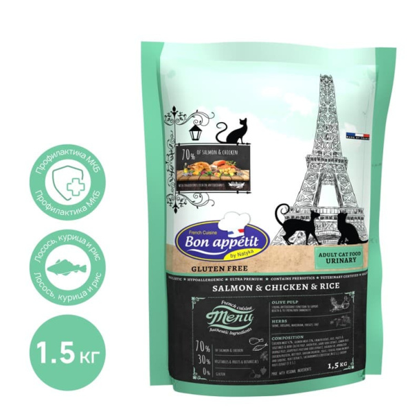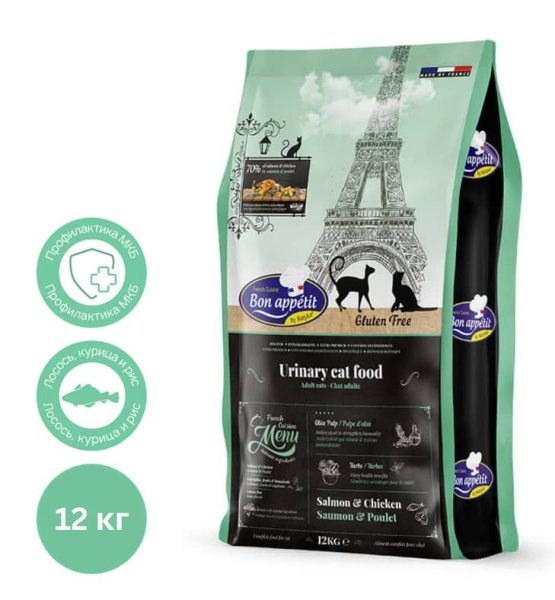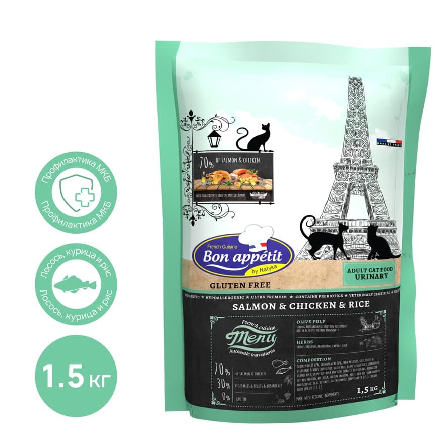 Bon Appetit CAT Adult Urinary (курица, лосось) - сухой диетический корм для взрослых кошек от 1 до 6 лет создан для профилактики мочекаменной болезни и сохранения здоровья мочевыводящих путей.