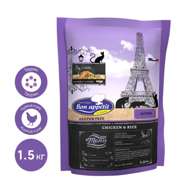 Сухой корм Bon Appétit Kitten от французского производителя — питательный, легкоусвояемый корм, содержащий 65% куриного мяса, чтобы удовлетворить пищевые потребности котят любой породы и возраста. Он также богат омега-3, 6 и 9 и содержит 9 антиоксидантов из оливок и цитрусовых, тимьяна, орегано, петрушки и майорана, которые помогают предотвратить многие заболевания. Этот рецепт идеален для котят до 12 месяцев, а также беременных кошек в период лактации.
