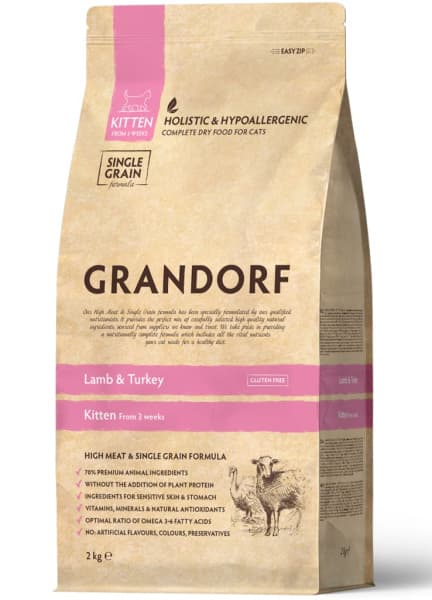 Grandorf Kitten (ягненок, индейка) - это низкозерновой гипоаллергенный рацион для котят старше 3 недель, а также кормящих и беременных кошек.