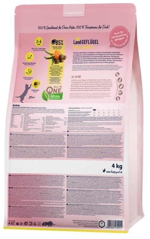 Полнорационный корм для котят с 5 недель до 6 месяцев Happy Cat Kitten LandGeflugel (птица). Содержит изысканное мясо птицы и вкусное мясо лосося. Полнорационный корм для котят с 5 недель до 6 месяцев. Happy Cat Kitten LandGeflügel содержит изысканное мясо птицы и вкусное мясо лосося. Маленькие крокеты отлично подходят для котят начиная с 5-й недели жизни.