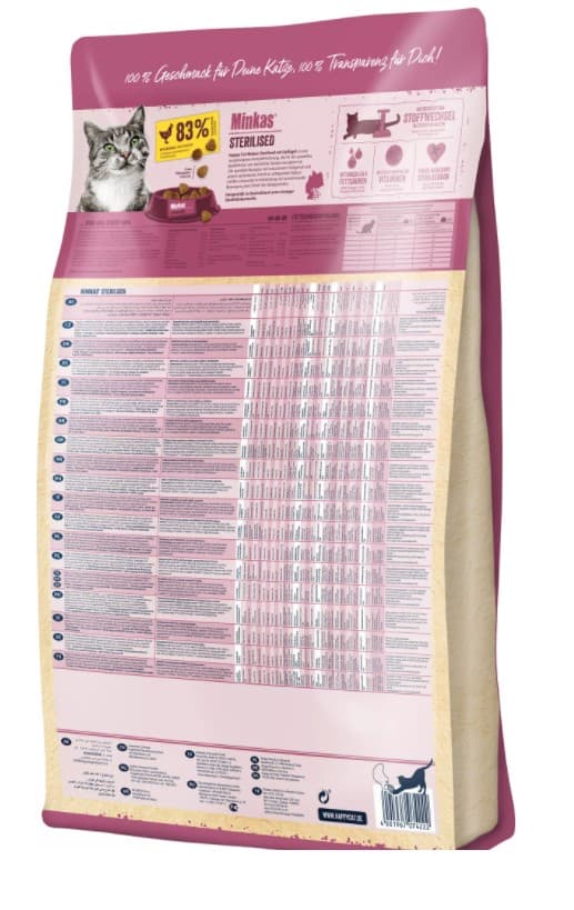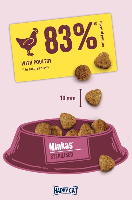 Happy Cat Minkas Sterilised - это сбалансированный комплексный сухой корм, разработанный с учётом особых потребностей кастрированных котов и стерилизованных кошек. Благодаря специальной рецептуре с низким уровнем жиров и оптимальным содержанием балластных веществ, этот корм в сочетании с достаточной физической активностью способствует поддержанию идеального веса.