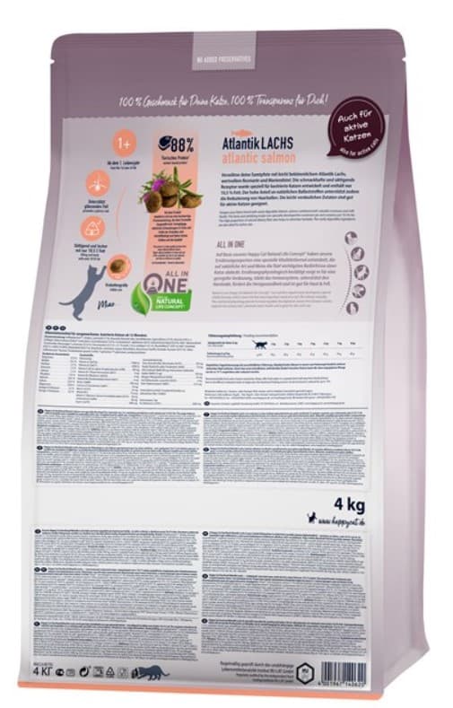 Happy Cat Sterilised AtlantikLachs - сухой корм разработан специально для кастрированных котов и стерилизованных кошек. Этот сытный и вкусный корм, богатый балластными веществами, содержит всего 10,5% жира и большое количество ценного белка животного происхождения из легко усваиваемого мяса лосося и вкусного мяса птицы.