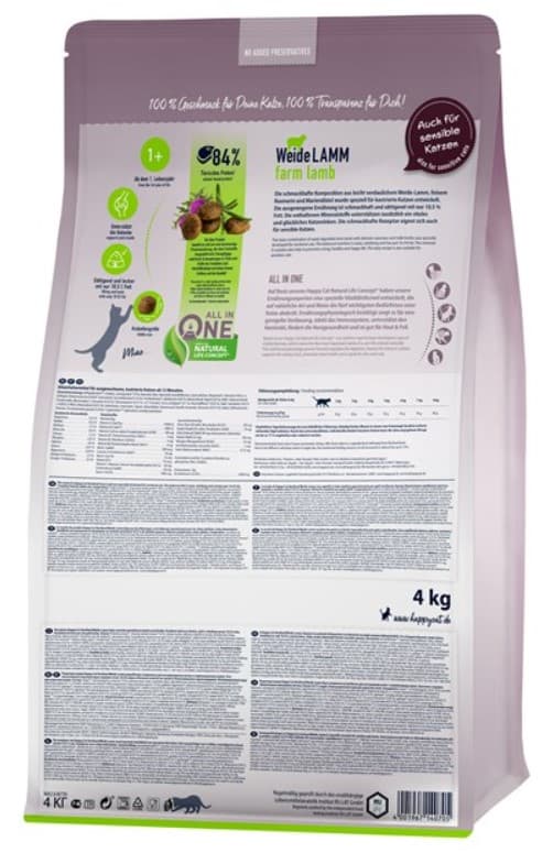 Корм для кошек Happy Cat Sterilized изготовлен из сытного фермерского ягнёнка, который действует как легкоусвояемый источник белка, он также обогащён избранными растительными ингредиентами, такими как розмарин и расторопша, чтобы обеспечить рецепт, богатый питательными веществами .. Этот сухой корм обеспечивает полноценное питание, что делает его идеальным ежедневным рационом даже для чувствительных кошек.