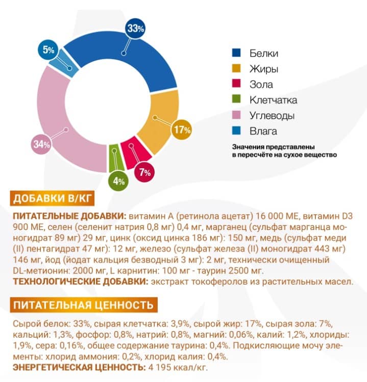 Подкисляющие мочу элементы: хлорид аммония: 0,2%, хлорид калия: 0,4%.
