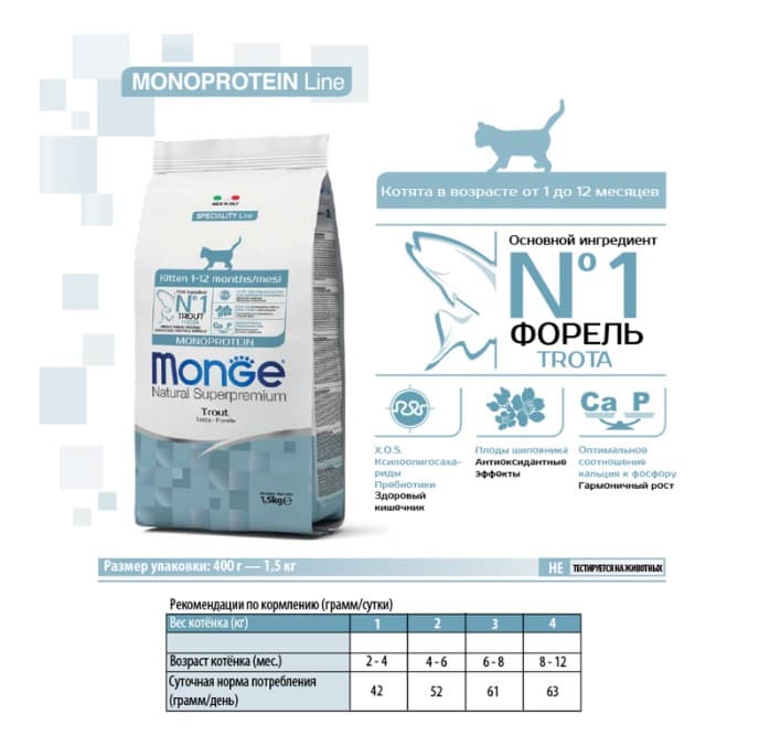 Monge Natural Superpremium Monoprotein* Kitten форель — полноценный и сбалансированный корм для котят с 1 до 12 месяцев. Специально разработан для благополучия вашего котенка благодаря оптимальному соотношению кальция и фосфора для сбалансированного роста.