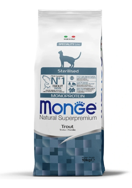 Monge Natural Superpremium Monoprotein* Sterilized Cat форель — полноценный корм для взрослых стерилизованных кошек и кастрированных котов.