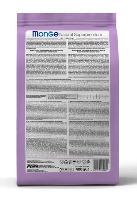 Линия Monge Natural Superpremium обеспечивает хорошее самочувствие животного благодаря правильному балансу основных питательных элементов, который является результатом исследований «Сделано в Италии».