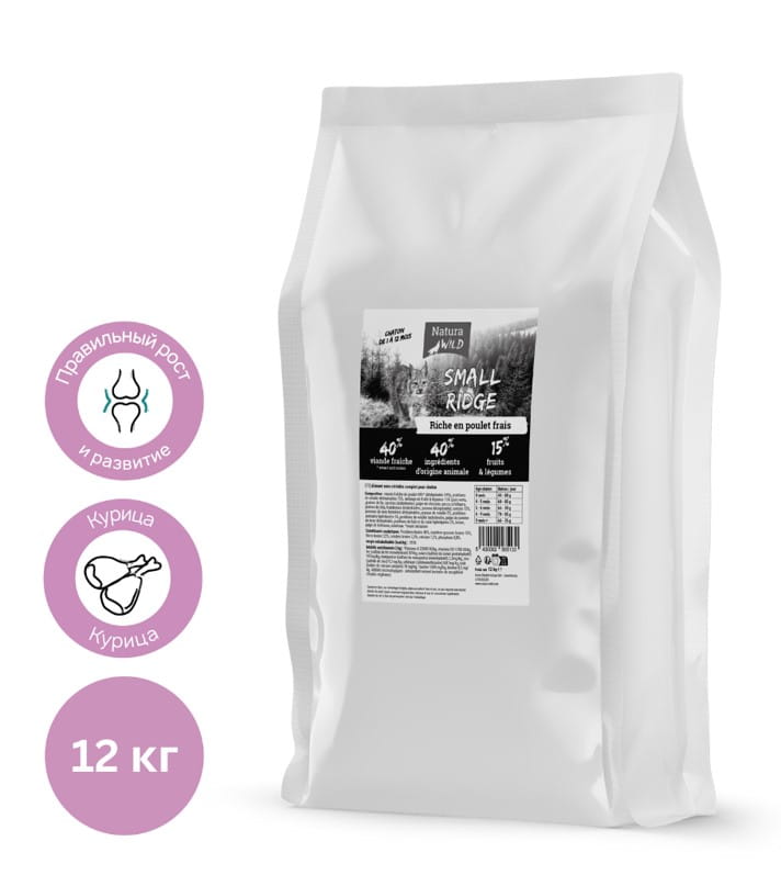 Natura Wild Kitten Small Ridge (курица) - это полнорационный сухой корм для котят от отъема до 12 месяцев, беременных и кормящих кошек, без злаков, богатый свежим куриным мясом.