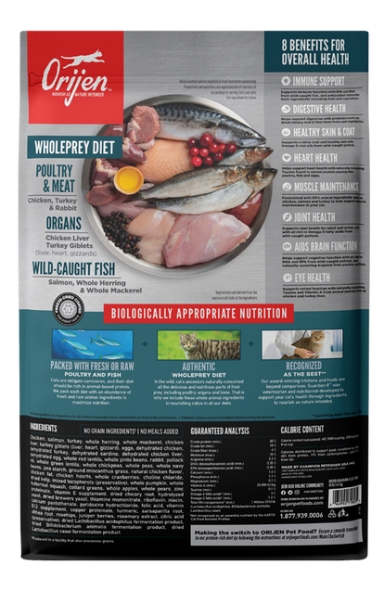 ORIJEN Guardian 8 состоит на 85 %* из ингредиентов животного происхождения, 2/3 из которых являются свежими и сырыми. Корм содержит питательные вещества в соответствии WholePrey (Добыча целиком), которые помогают поддерживать общее состояние здоровья вашей кошки на высоком уровне.