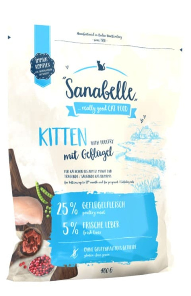 Корм Бош Санабель Киттен произведён на основе свежего мяса домашней птицы, специально для беременных и кормящих кошек, а также котят от 1 месяца. Особый состав, насыщенный питательными веществами и минералами, позволяет беременным и кормящим кошкам, а также котятам получать все необходимые полезные вещества и минералы, способствующие здоровому развитию, а также стимулирует образование молока и увеличивает срок лактации у кормящих кошек. Использование экстракта зеленогубчатого моллюска благотворно влияет на развитие хрящей и суставов животного. Корм не вызывает аллергических реакций, а также улучшает пищеварение и нормализует обмен веществ.