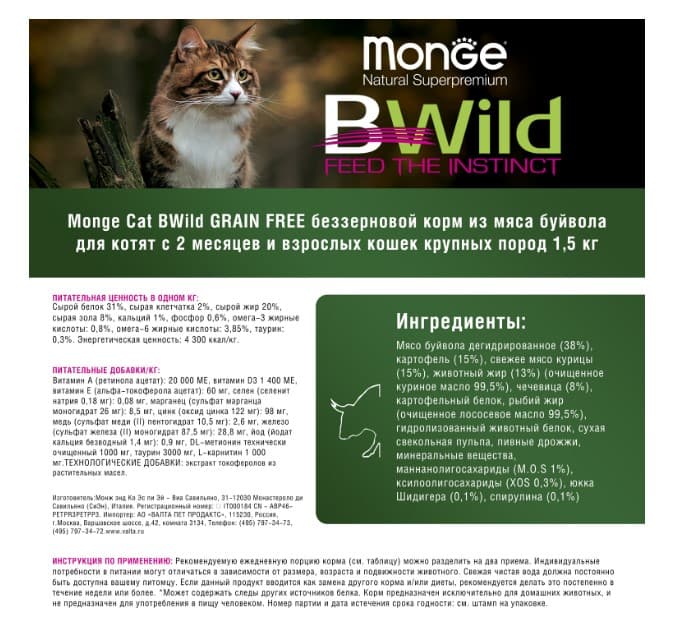 Monge Natural Superpremium BWild Grain Free Formula Cat Large Breed All Life Stage Buffalo с картофелем и чечевицей — это полнорационный и сбалансированный корм для крупных кошек, котов и котят с двух месяцев.
