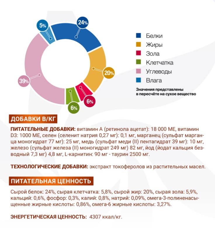Дегидрированная курица, маниока (тапиока), куриный жир (законсервированный смесью токоферолов и экстрактом розмарина), дегидрированный горох, картофель, сублимированная рыба (анчоус), нерастворимые волокна гороха, утиный жир, дегидрированная морковь, DL-метионин, масло лосося, яблочная мука, сухой экстракт ананаса, концентрат картофельного белка, витамины, минеральные соли, сердцевина ананаса, ксилоолигосахариды (0,4%), микроэлементы (включая хелатные формы), таурин, юкка Шидигера, экстракт камелии китайской (0,015%), сублимированная мякоть дыни (0,005% — источник супероксиддисмутазы).Ингредиенты