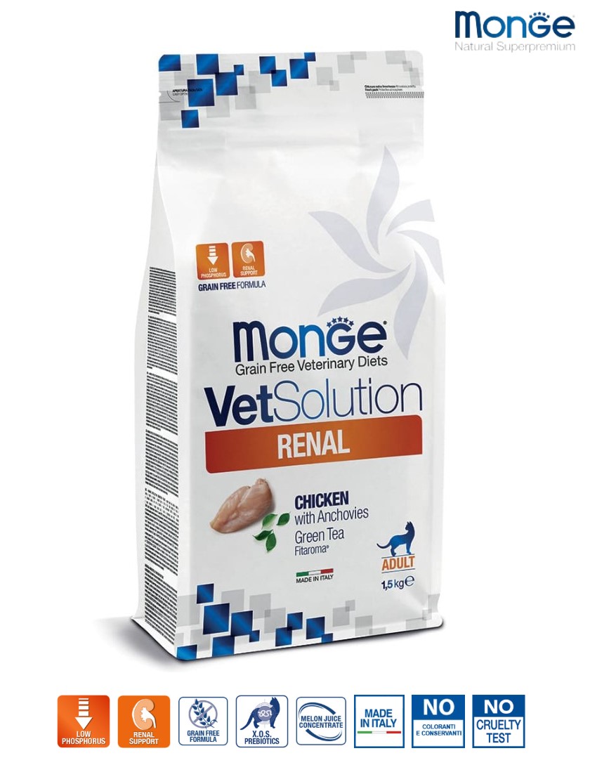 Монж ВетСолюшн Кэт Ренал - полнорационный диетический корм для поддержания функции почек у кошек при острой или хронической почечной недостаточности.