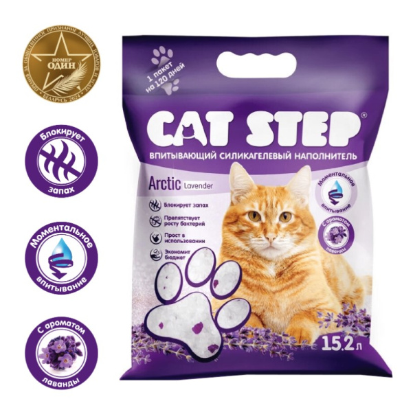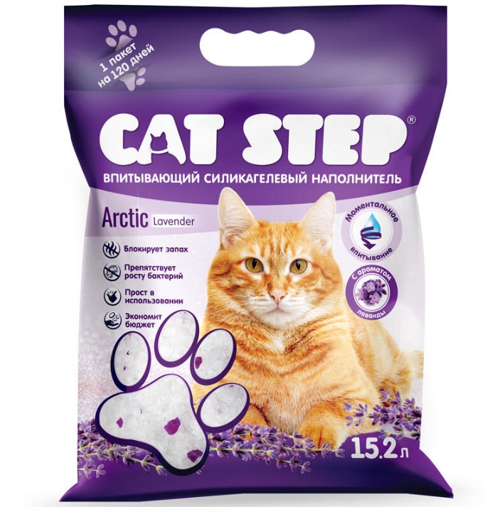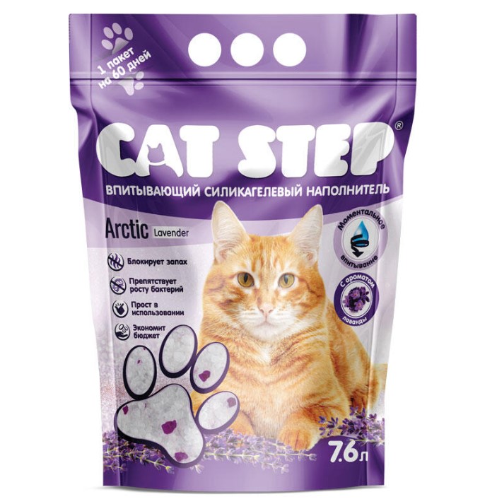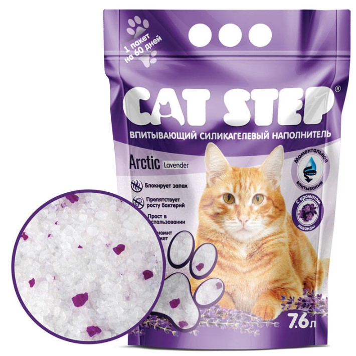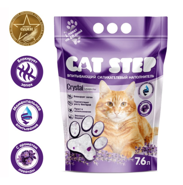 Cиликагелевый наполнитель для кошачьего туалета CAT STEP Crystal Lavеnder моментально впитывает влагу и уничтожает запахи. Пористая структура кристаллов обеспечивает их высокую способность к поглощению жидкостей и запахов. Наполнитель препятствует размножению и развитию бактерий и грибков за счет своего неорганического происхождения. Наполнитель не требует постоянного контроля и ежедневной уборки кошачьего лотка. Содержимого пакета 7,6 л хватает в среднем на 2 месяц использования. Содержит фиолетовые гранулы c легким ароматом лаванды, активирующимся при контакте с жидкостью. Заполните сухой и чистый лоток наполнителем CAT STEP Crystal Lavеnder слоем 3-5 см. Регулярно удаляйте экскременты и перемешивайте наполнитель для равномерного распределения свежих кристаллов. Примерно через 4 недели удалите использованные гранулы и замените их новой порцией наполнителя. Не выбрасывайте использованный наполнитель в унитаз.
