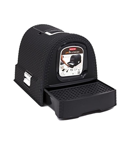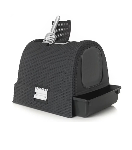 Изготовлен из чрезвычайно прочного материала ротанга, высококачественного плетеного пластика. Есть выдвижной ящик, можно сразу увидеть, нужно ли менять подстилку. В верхней части коробки есть удобное место для хранения совка.
