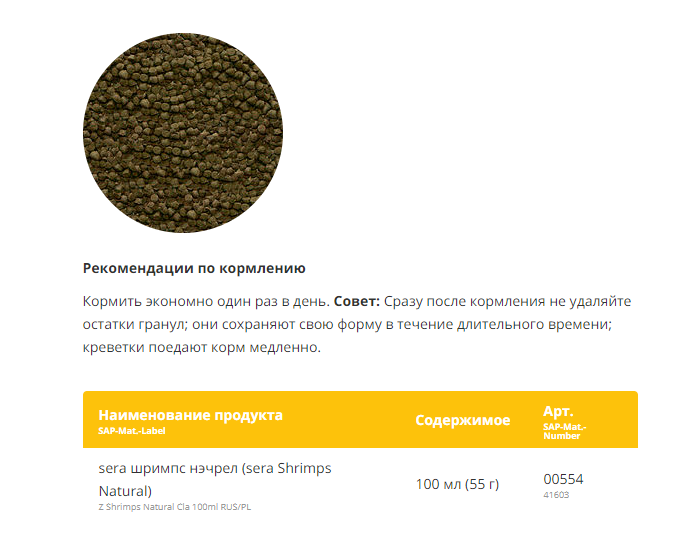 Инструкция по применению: Кормить экономно один раз в день. Совет: Сразу после кормления не удаляйте остатки гранул; они сохраняют свою форму в течение длительного времени; креветки поедают корм медленно.