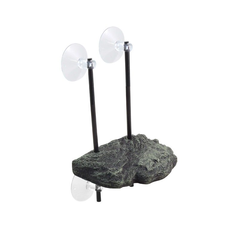 Плавающий плотик для водных черепах. Пластиковые направляющие крепятся к стенкам акватеррариума с помощью присосок, по направляющим свободно перемещается плотик, держащийся на поверхности воды за счет пористой структуры. При оформлении плотика применяется краска, устойчивая к механическому истиранию. Неровная поверхность имитирует скалистый берег.