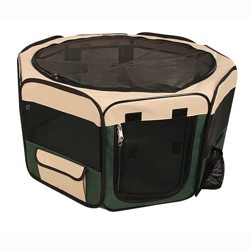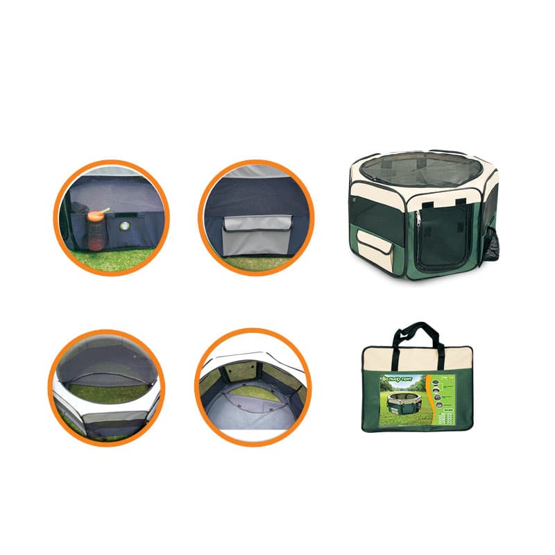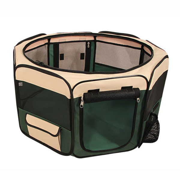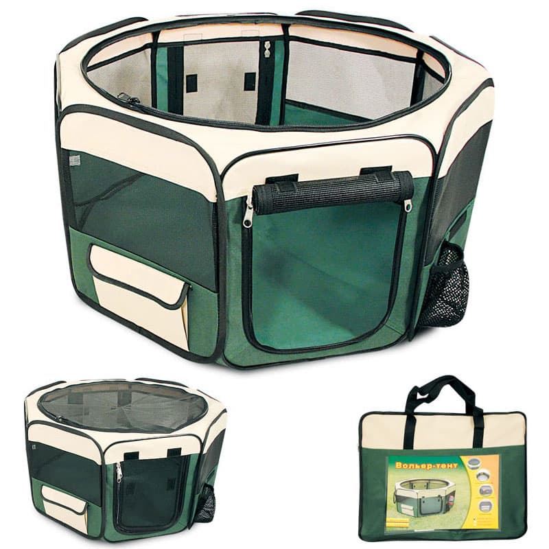 Удобный складной матерчатый вольер-тент Triol - универсальное решение для владельцев собак. Его можно использовать как на улице, так и в помещении в качестве основного места для собаки. Незаменимым атрибутом дом-тент является для владельцев собак на выставках и при перевозке во время длительных путешествий. Дополнительная сетка (идет в комплекте) не дает возможности животному выбраться, а вшитая металлическая конструкция в разложенном виде крепко натягивает ткань, обеспечивая изделию максимальную устойчивость. Изделие имеет удобное отделение для поилки, съемная сетчатая крыша позволяет питомцу свободно дышать, а непромокаемое дно надежно фиксируется при помощи липучек и легко стирается в стиральной машине. Цвет: бежево-зеленый.