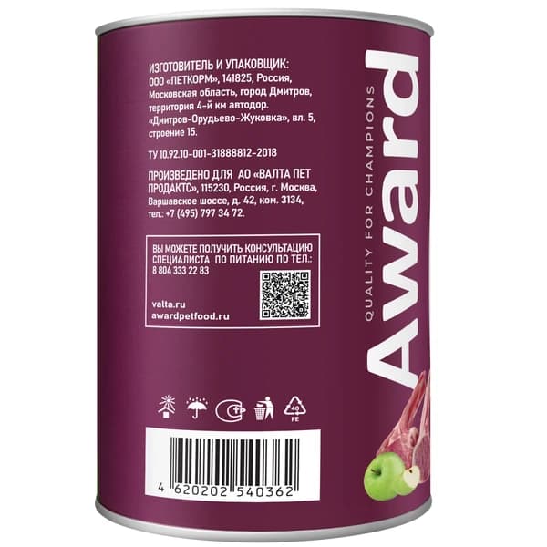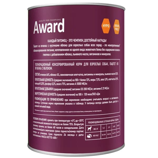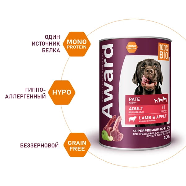 Паштет Award Dog из ягненка с кусочками яблока для взрослых собак - это монопротеиновое сбалансированное питание суперпремиум класса для любимого питомца, изготовленное из одного вида мясного белка без содержания зерна и глютена, с добавлением овощей и фруктов богатых витаминами и минералами.