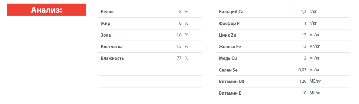 Курица (не менее 50%), говядина и мясные субпродукты (не менее 44%), говяжье вымя и селезёнка (не менее 11%), печень свиная (не менее 3%), тыква (min 3%-max 4%), подсолнечное масло, свекловичная клетчатка (не менее 1,5%), витамины и минеральные вещества.