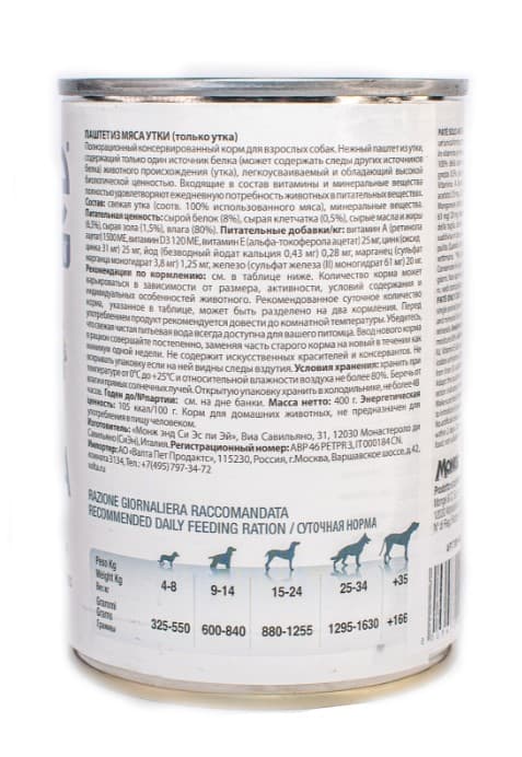 Монобелковый паштет Monge (Монж) Dog Monoprotein Adult Rabbit (утка) - это беззерновые консервы для собак на основе только одного вида животного белка — утка.