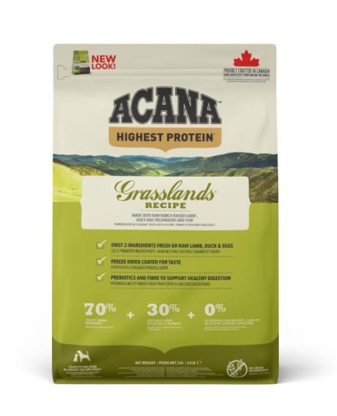 Корм ACANA Grasslands Dog содержит мясо выкормленного на пастбищах ягненка, выращенной на свободном выгуле утки, яйца несущихся в гнездах кур и свежевыловленную рыбу. Все ингредиенты доставляются из нашего региона свежими или сырыми и используются в соотношении WholePrey («добыча целиком»), сохраняя все полезные вещества и не требуя включения большого списка искусственных добавок. Корм содержит мало углеводов, зато богат животным белком для поддержания отличной физической формы.