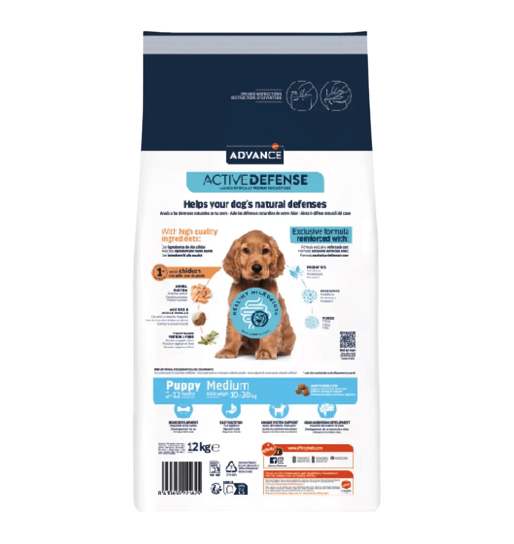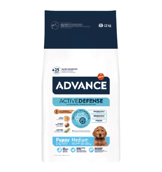 Advance Medium Puppy представляет собой продвинутый корм, составленный для удовлетворения специальных пищевых потребностей Вашего щенка средней породы за счет содействия развитию его пищеварительной и иммунной систем, помощи в укреплении его защитных сил и обеспечения надлежащего роста его костей с использованием корма, который легко усваивается.