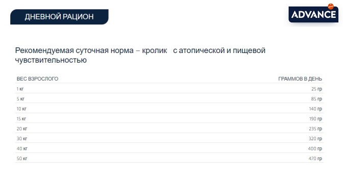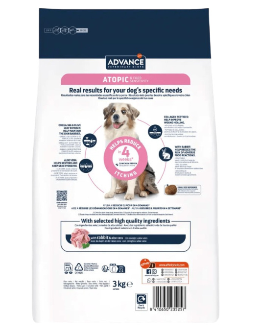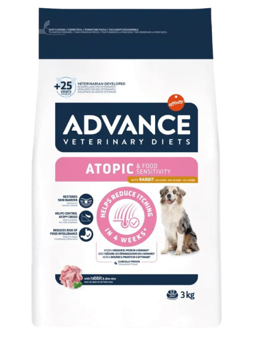 ADVANCE VETERINARY DIETS ATOPIC RABBIT & PEAS представляет собой полный и сбалансированный диетический продукт для взрослых собак, составленный для ухода за кожей Вашей собаки, если она имеет дерматит и избыточную потерю шерсти, а также для снижения непереносимостей к ингредиентам и питательным веществам.