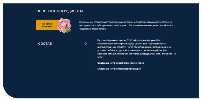 Состав: гороховый крахмал, крольчатина (17%), горох (17%), дегидрированные белки кролика, животный жир, в качестве стабилизатора используется смесь токоферолов натурального происхождения, гидролизованный коллаген (3.2%), свекольная стружка, гипоаллергенная вкусовая добавка, дрожжи, соевое масло,, карбонат кальция, соль, монокальцийфосфат, экстракт из листа оливкового дерева (0.05%), биотин, алоэ вера (50 мг/кг), источники белка: крольчатина, горох и дрожжи.