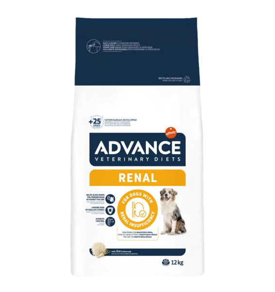 ADVANCE VETERINARY DIETS RENAL представляет собой полный диетический продукт для взрослых собак, который имеет ограниченное содержание белка, но высокое его качество и низкие уровни фосфора, и он является особенно рекомендуемым для поддержки функции почек в случаях хронического заболевания почек.