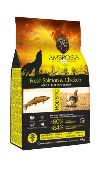 Ambrosia (Амбросия) Grain Free Dog Adult Mini (лосось, курица) - сухой беззерновой полнорационный корм для собак мелких пород.