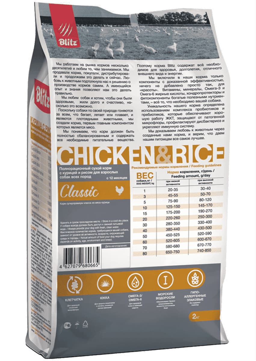 Куриное мясо — один из самых распространённых источников белка в кормах для собак и имеет ряд неоспоримых преимуществ. Оно прекрасно усваивается и содержит много полноценного животного белка и мало жира. А рис — один из самых гипоаллергенных источников углеводов, замечательная альтернатива пшенице, которая достаточно часто является виновницей пищевой аллергии у собак. Курица в сочетании с рисом составляет основу корма Blitz Adult Chicken & Rice, предназначенного для питания взрослых собак. Мы разрабатывали этот рацион специально для животных, находящихся в самой активной фазе своей жизни, поэтому обогатили его витаминно-минеральным комплексом и пробиотиками.