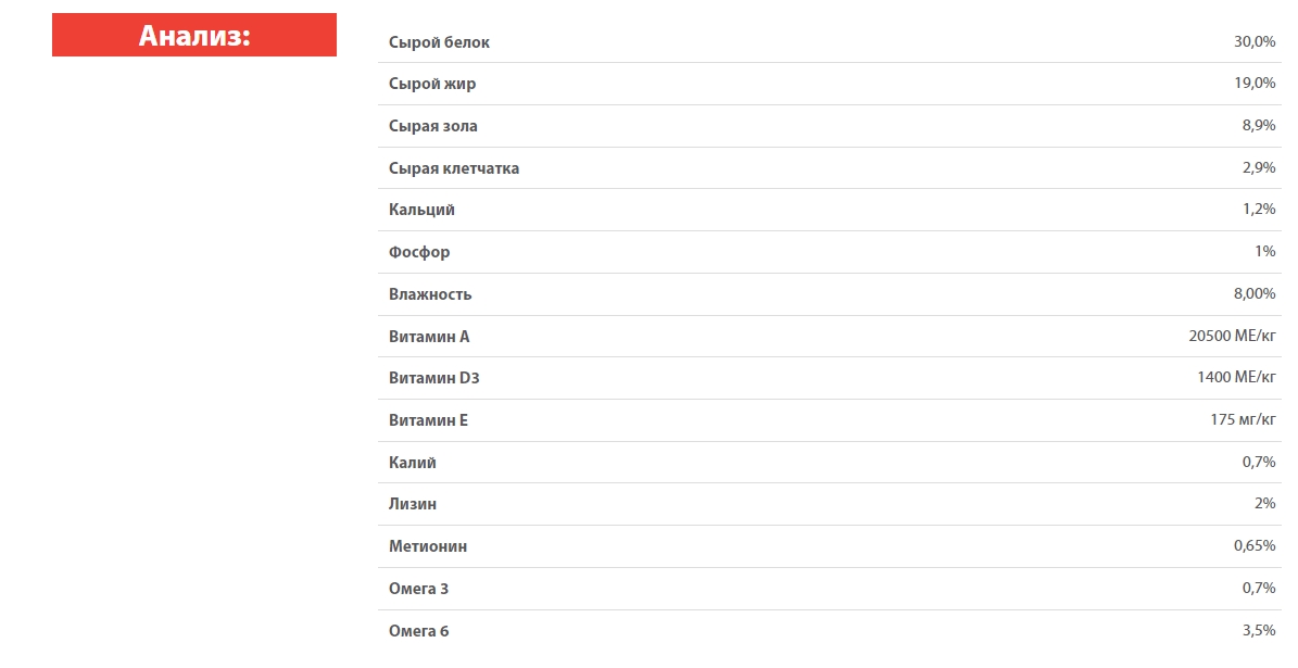 Свежее мясо индейки (25%), дегидрированное мясо утки (21%), картофель (14%), куриный жир (10%), горох, бобы, гороховый крахмал, льняное семя (3%), гидролизованная печень (2%) , дрожжи, сушёная мякоть свеклы, морские водоросли (0,3%), мякоть сушёного цикория, маннаноолигосахариды (MOS 0,2%), мохаве юкка (0,03%), семена расторопши (Silybum marianum L.) (0,02%), сушёный корень одуванчика (Taraxacum officinale W.) (0,02%), сушеные цветы гибискуса (Hibiscus sabdariffa L.) (0,016%), сушёные плоды шиповника (Rosa Canina LR, Pendulina L.) (0,002% ).