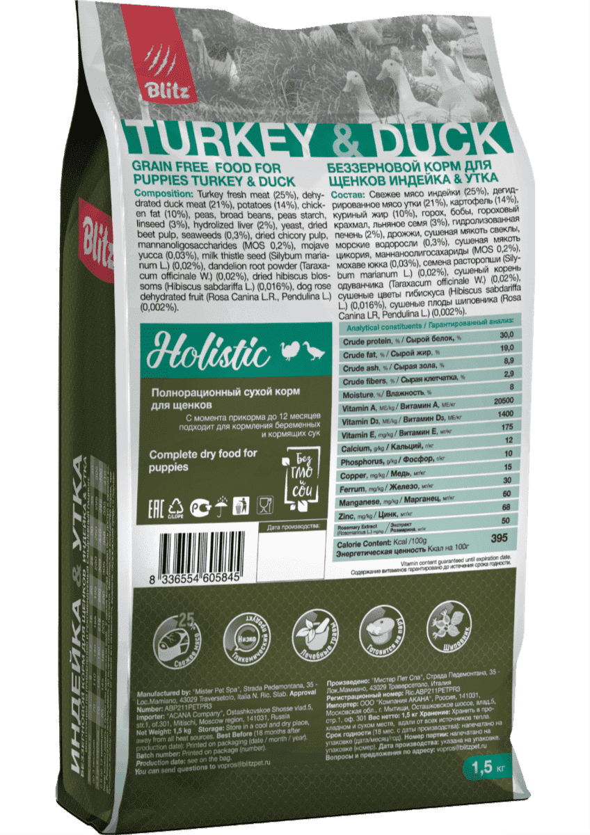 Рацион «Блиц» с индейкой и уткой для щенков не содержит зерна, в нём нет искусственных добавок, красителей и консервантов — только много мяса и другие натуральные компоненты, которые позволят вашему любимому питомцу вырасти здоровой и сильной собакой, чтобы радовать вас долгие годы.