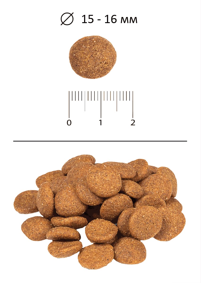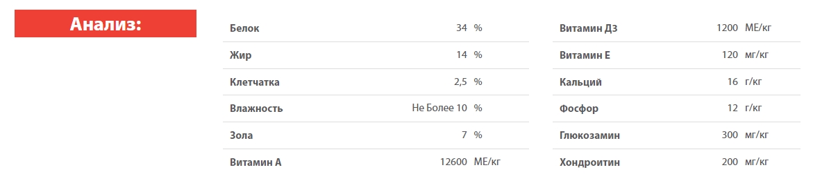 Состав: Дегидрированное мясо курицы (35%), цельный рис, цельная кукуруза, гидролизованный белок, куриный жир, рыбий жир, сушеная мякоть свеклы, витаминно-минеральный комплекс (витамины: A, D3, E, холин хлорид, B3, B5, B2, B1, B6, фолиевая кислота, B12, калий, цинк, железо, марганец, медь, йод, селен), гидролизованные мясные субпродукты, кукурузные рыльца, дегидратированное яйцо, дрожжи - источник маннаноолигосахаридов (MOS), DL- метионин, L-лизин, антиоксидант, L-карнитин, глюкозамина гидрохлорид, пробиотик - живые микроорганизмы Bacillus subtilis и Bacillus licheniformis, хондротина сульфат, экстракт розмарина, экстракт Юкки Шидигера, экстракт фенхеля, экстракт фукуса.