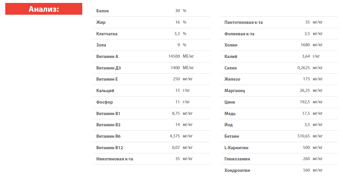 Состав: Дегидрированное мясо ягненка и индейки (35,5%), цельный рис, цельная кукуруза, рыбий жир, куриный жир, гидролизованный белок, сушеная мякоть свеклы, витаминно-минеральный комплекс (витамины: А, D3, E, холин хлорид, бетаин, В3, В5, В2, В1, В6, фолиевая кислота, В12, калий, цинк, железо, марганец, медь, йод, селен), гидролизованная печень курицы, кукурузные рыльца, дегидратированное яйцо, дрожжи – источник маннаноолигосахаридов (MOS), яблоко сушеное, инулин – фруктоолигосахарид (FOS), L-карнитин, глюкозамина гидрохлорид, пробиотик – живые микроорганизмы Bacillus subtilis и Bacillus licheniformis, экстракты фенхеля и розмарина, хондроитина сульфат, экстракты фукуса и юкки Шидигера, антиоксидант.