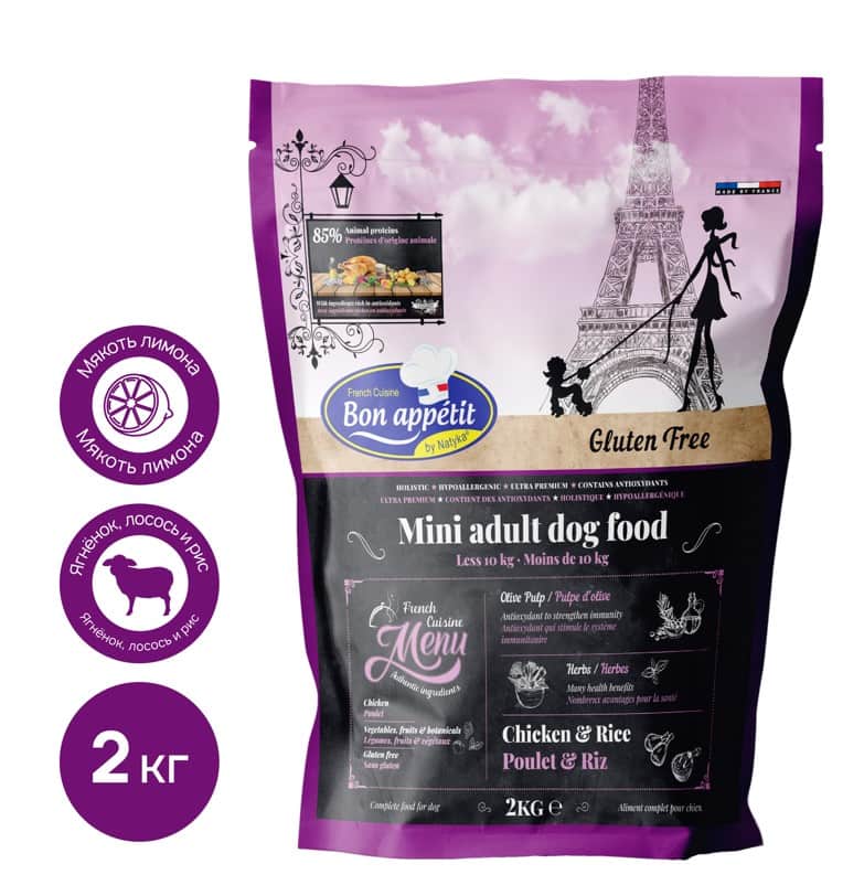 Bon Appetit DOG Adult Mini (курица, рис) - сухой корм для собак мелких и миниатюрных пород весом от 1 до 8 кг. Комплексное сбалансированное питание, обеспечивающее питомца необходимыми витаминами и микроэлементами при особых потребностях его организма.