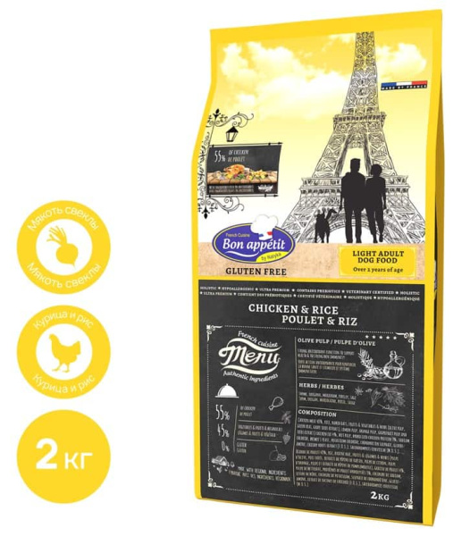 Bon Appetit DOG Light (курица, рис) - корм для взрослых собак с профилактикой лишнего веса, склонных к набору веса.
