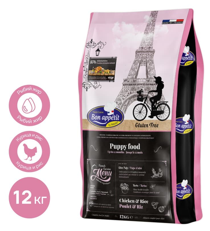 Bon Appetit DOG Puppy (курица, рис) - сухой полнорационный корм для щенков всех пород от 1 до 12 месяцев. Комплексное сбалансированное питание, обеспечивающее питомца необходимыми витаминами и микроэлементами для здорового роста и правильного развития.