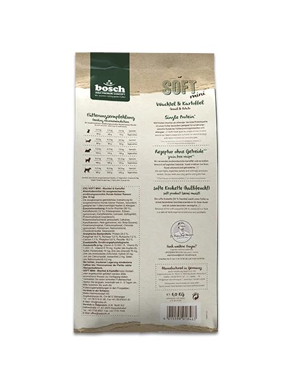 Корм Soft Mini с перепелкой и картофелем - это полувлажный беззерновой корм, созданный для взрослых собак мелких пород. Высокое содержание свежего мяса (не менее 50%), в качестве единственного источника протеина, особая полувлажная консистенция (19% влаги), а также отсутствие злаков в составе снижают риск пищевой непереносимости и аллергии. Легкоусвояемый картофель является источником углеводов. Форма и размер гранул специально адаптированы для собак мелких пород.