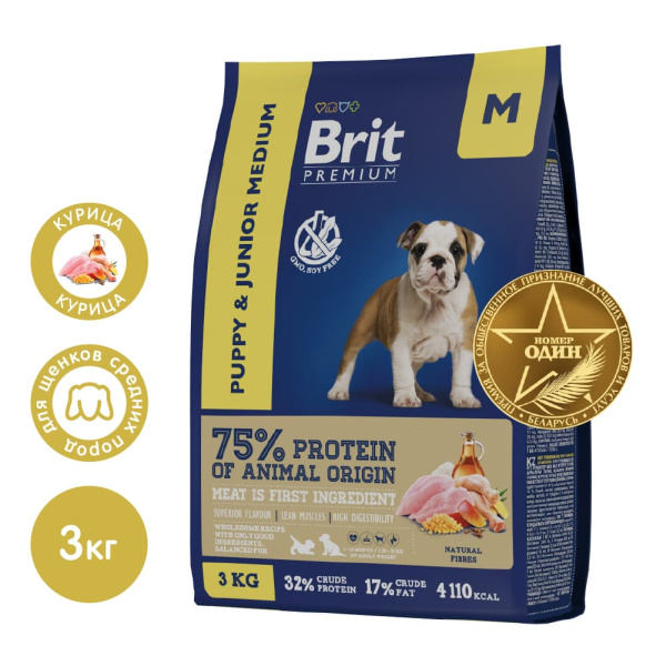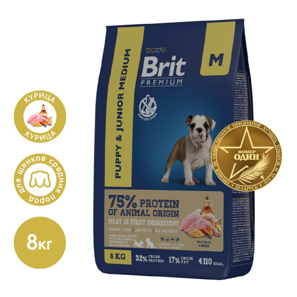 Brit Premium Junior Medium - полнорационный сухой корм для щенков и молодых собак средних пород (1-12 месяцев), (10-25 кг). Подходит для беременных и кормящих собак. С высоким содержанием курицы (50%).
