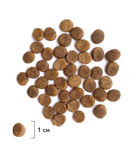 Состав: дегидрированное мясо 30%, в том числе мясо курицы 16%, пшеница, глютен кукурузный, жир куриный, кукуруза, мясной соус 2 %, яблоко сушеное, дрожжи (источник маннанолигосахаридов), витаминно-минеральный комплекс, топинамбур (инулин - источник фруктоолигосахаридов), антиокислитель, экстракт юкки Шидигера, экстракт розмарина.